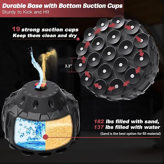 - New-design Base and upgraded with 19 Strong Suction Cups: Lager and double layer design base is about 12 feet high. Up to 250 lbs filled with sand, 137 lbs with water approx. Together with 19 bottom suction cups, increasing suction power. Sand is the best option for filling material. Please keep suction cups on clean and smooth surface