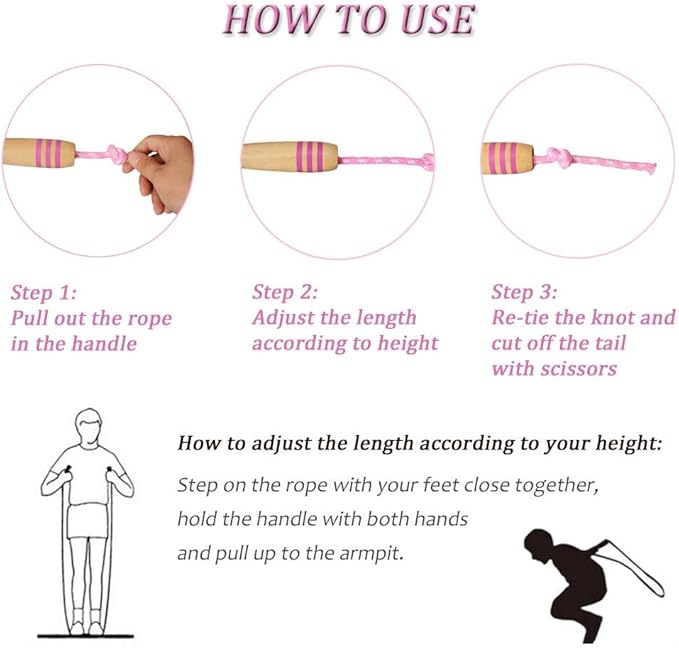 - 【Boys & Girls Kids Jump Rope】 You will get 2 pcs 8.5ft/2.6m length children's skipping ropes with wooden handle(blue & pink), which boys and girls like. Fun activity games can play with friends or family.