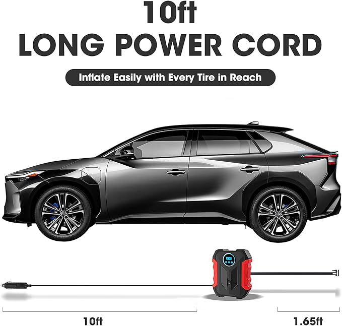 - 【150PSI MAX WORKING PRESSURE】:With maximum pressure 150 PSI and air flow 35L/min, it can inflate the 195/65/R15 car tire from 0 to 35psi under 5 minutes. It's much faster and more effective than traditional pumps, and comes with an accurate tire pressure gauge.