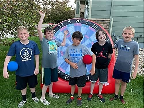 - Ultimate Darts Game - Get ready to KICK and THROW! Our giant inflatable dart board is your complete solution for yard games! Includes: 6 sticky balls, 6 tennis balls, and an air pump for your convenience.