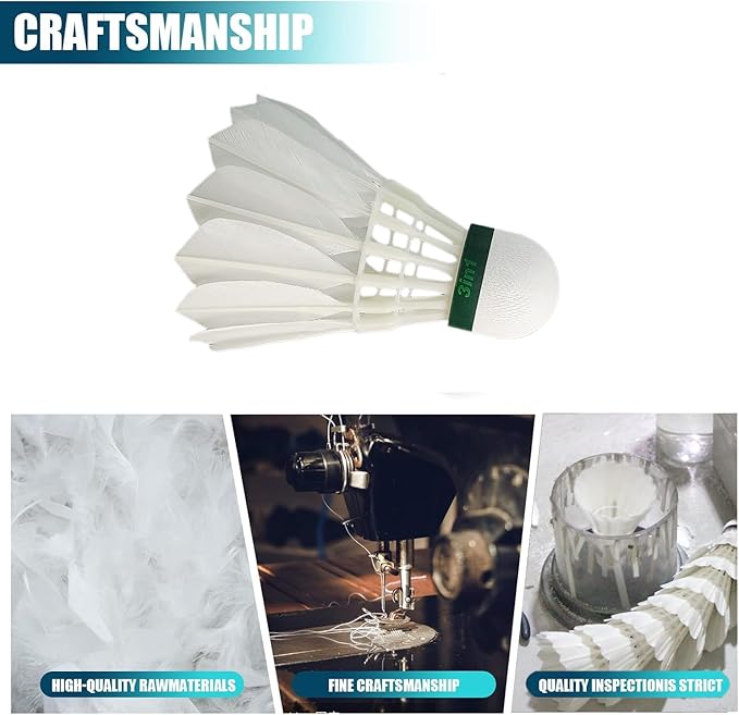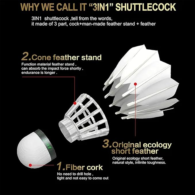 - 【3-in-1 Design】: Our hybrid shuttlecocks feature a Fiber head, a sturdy nylon shaft, and real feathers, offering the perfect balance between performance and durability.
