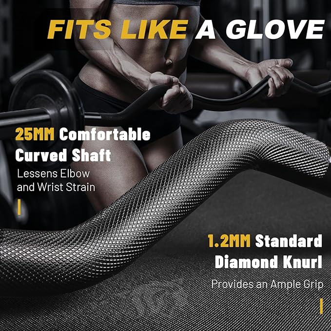 - Comfortable Curved Shaft: The 25mm bent shaft of our curl bar is designed for maximum comfort and effectiveness. The thoughtfully crafted cambered angles place your hands in a natural position, significantly reducing strain on your elbows and wrists. Experience a targeted and challenging workout that activates your biceps and triceps the way theyβre supposed to.