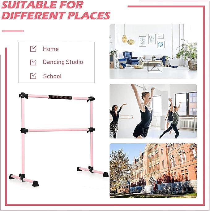 - [ Adjustable Height & Easy-to-operate Knob ]: Coming with 6 premium fasteners, this freestanding ballet barre with 2 bars can be adjusted from 7β to 47β. You can easily adjust the height of bars by rotating the knob smoothly. The double ballet bar is perfect for people of different heights so that it is able to be used by kids and adults. <br></p>