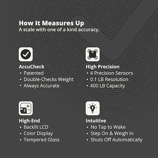 - Accurate Bathroom Scales for Weight: Our AccuCheck system guarantees accurate readings with four high-precision sensors. The digital scale measures body weight and fat up to 400 lbs.
