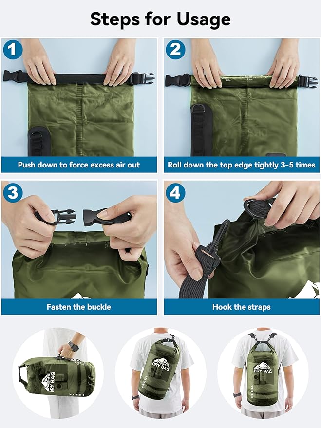 - Waterproof - Built with professional seamless technology, our dry bag keeps your items and valuables dry during water sports like boating and kayaking. Note: It can handle accidental submersion, but should not be kept underwater for extended periods