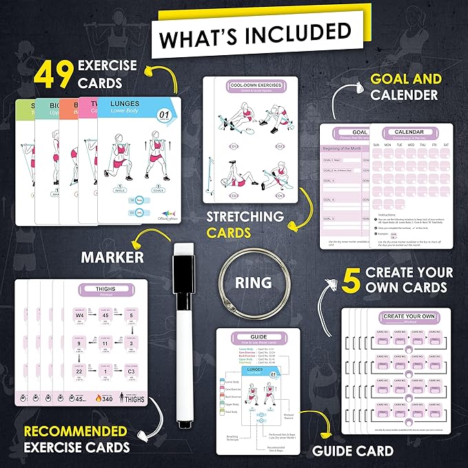 - Customize Your Workout - Never get bored rather tweak your exercise routine with the ease of designing your own schedule, using our unique workout " Recommendation Cards ". Keep a track of your progress using the starter Dry-Erase marker included in the Box.