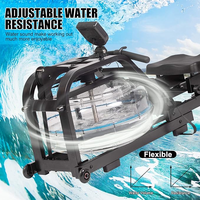 - Water Resistance | 4 mm thickness poly-carbonate water tank with Three-page PP paddle. water rowing machine is specially designed to approach the real stroke on water. You could adjust the amount of water to control resistance according to your exercise needs.