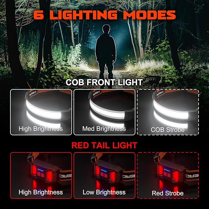 - [Versatile Modes for Any Situation]: The headlamp with a red light offers 6 different lighting modes. One-button control COB front light(high, low, strobe) and one-button control RED tail light(high, low, strobe). Having 2 buttons to control the front light and tail light means that you can customize various combinations according to your needs. Our headlamps for adults are versatile and adaptable for many situations, ensuring you have the right light for any adventure.