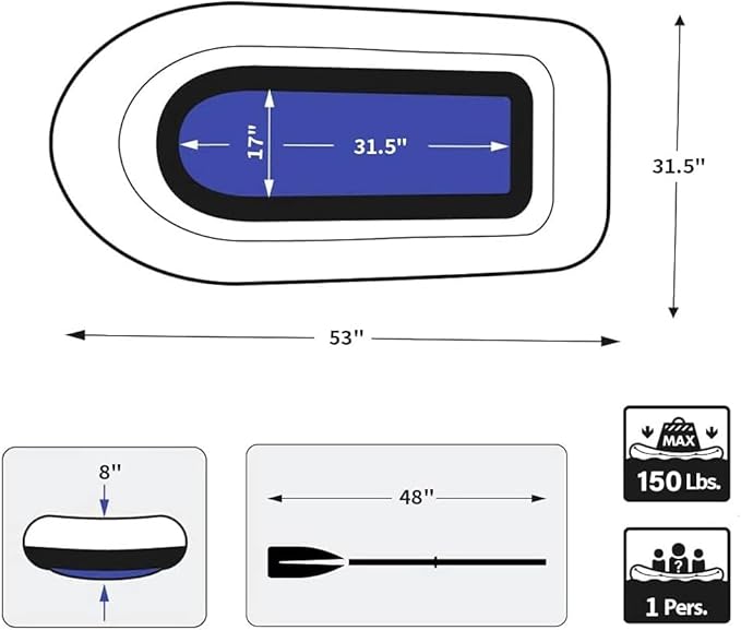 - 【Durable】 59.1"x 39.4" .The inflatable boat is designed with heavy duty, suitable for one people to use, load bearing is up to 150lbs.