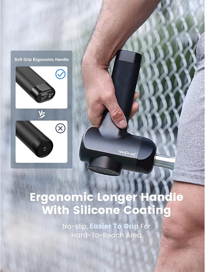 - 【Ultra-Quiet and Professional-Grade Deep Muscle Relief】Thanks to its brushless motor, reduces noise 80% more effectively than other massagers. Depending on speeds, this handheld massage gun typically runs as low as under from 30-50dB to maxium the comfort. Weighs only at 1.9 pounds with an extended non-slip ergonomic latex handle, makes it perfect for on-the-go use.