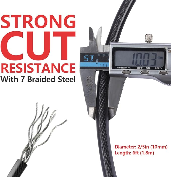 - [Protective Coating] Bike steel cable is 3/8 in diameter and is covered in a weather resistant PVC material to remain useful in all types of weather, can effectively avoid rust and scratching valuables.