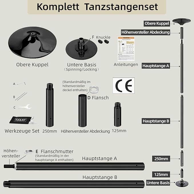- 【Height Adjustable】The standard dancing pole kit fits the ceilings from 7.38 to 8.85 feet. This kit includes 2 optional extension poles and a flexible height adjuster(The top part) . If your ceiling is higher than 8.85 feet, Please purchase the extension poles separately on our amazon store, which is 125mm (4.92inch),250mm(9.84inch) and 500mm(19.7inch). Please do make sure your have get the exact ceiling height before placing the order