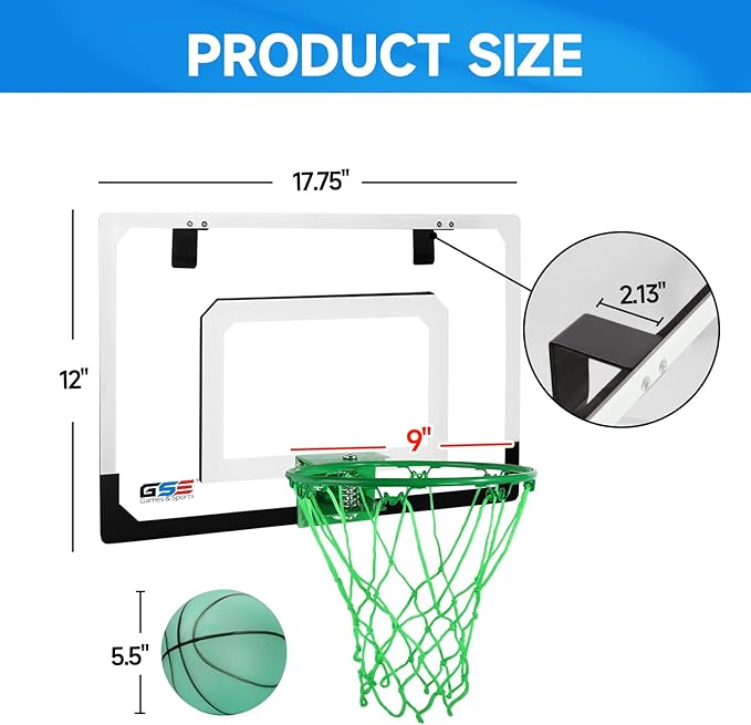 - Material: The basketball backboard is made from clear impact resistance polycarbonate, shatter resistant and robust, and has excellent durability; the thick protective EVA foam padding on the backboard in order to minimize the impact on the door and for noise abatement; the basketball backboard dimensions are 17.75" x 12"