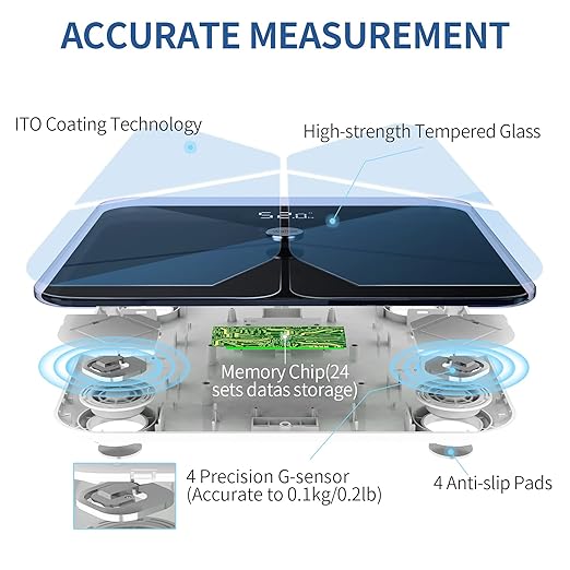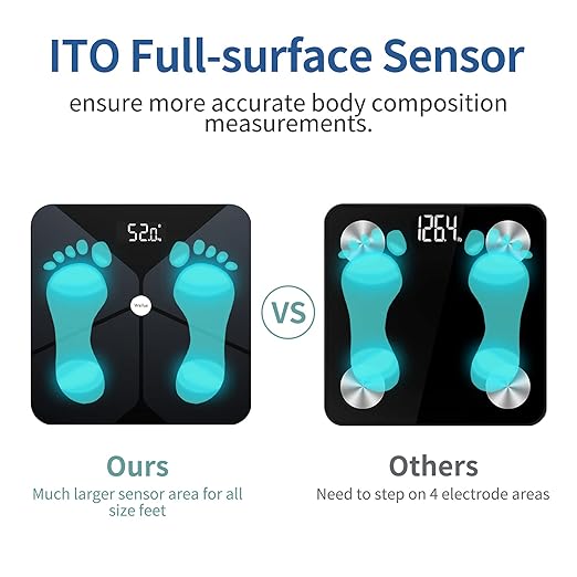 - High Accurate Digital Weight Scale: Compare with other scales for body weight and fat with 4 electrode areas, our scale with body fat and water weight adopts advanced ITO coating technology, provides much larger sensor area for for all size feet, makes more precise measurements. Built with 4 high-precision sensors, the measurement result is accurate to 0.2Ibs/0.1kg. The maximum weight capacity of bathroom scale reaches to 400lb.(Please place body fat scale on a hard, flat surface. Avoid carpet)