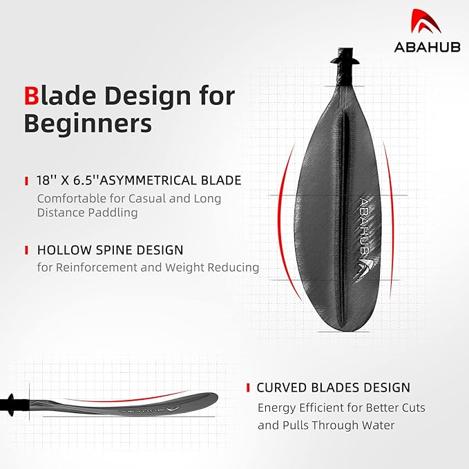 - ENERGY EFFICIENT BLADE DESIGN: With 18'' x 6.5''Asymmetrical blades, this paddle is comfortable and energy saving, both for casual and long distance paddling. The blades are feathered with a hollow spine for reinforcement and less weight. All these add up to better cuts and pulls through water.