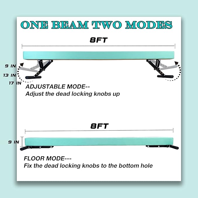- One Beam Two Modes:The balance beam designed with two modes,One mode is floor beam,Height is 7",support beginners basic gymnastics levels,One mode is adjustable balance beam,heights is 7" to 17" and 7"-29" two different type for choice,each mold can change easily by one person even a kid