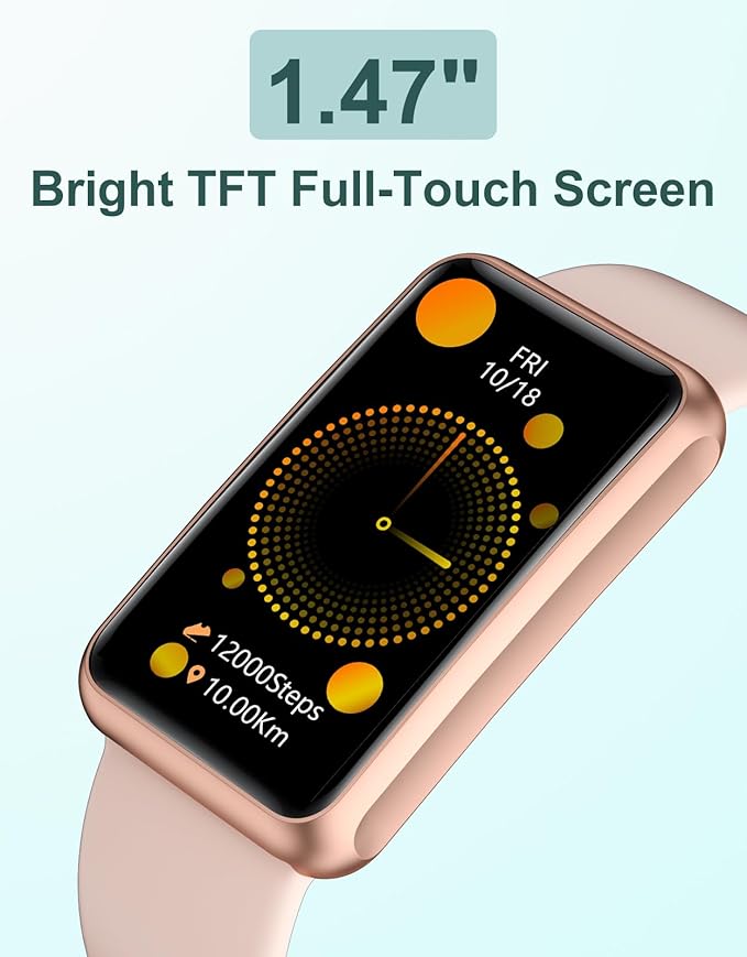 - 【Fitness Tracker With Large Color Touchscreen】Unlike most traditional fitness trackers with just touch button, our fitness tracker featuring a large 1.47-inch TFT full-touch color screen with adjustable brightness, it ensures smooth using experience and clarity for you. With 5 built-in watch dials, this fitness watch suits for women and men.