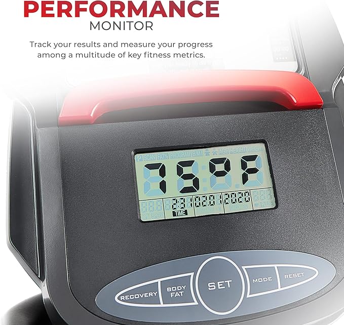 - PERFORMANCE MONITOR: Track your exercise metrics independently with the onboard performance monitor which displays: Body Fat, Calendar, Calories, Clock, Distance, Pulse, Recovery, RPM, Speed, Time, Temperature, Scan.