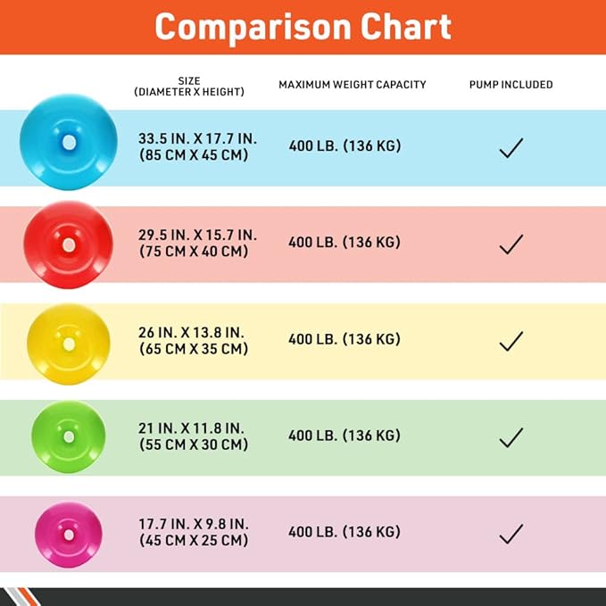 - FOR ALL USERS. Suitable for beginners to experienced professionals, this training ball is available in five color-coded sizes with diameters from 17.7 in. (45 cm) to 33.5 in. (85 cm), designed to fit both children and adults. Included with the ball are two plugs, one plug remover, and an easy-to-use pump to inflate the ball.
