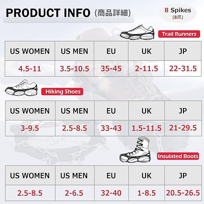 - ✅ MULTIPLE USES: Used on angled terrain, snow and ice roads, icy driveway, muddy and wet jungle, damp grass lawn, dangerous sections of trail, etc. Great for trail running, hiking, jogging, walking, ice fishing, mountaineering