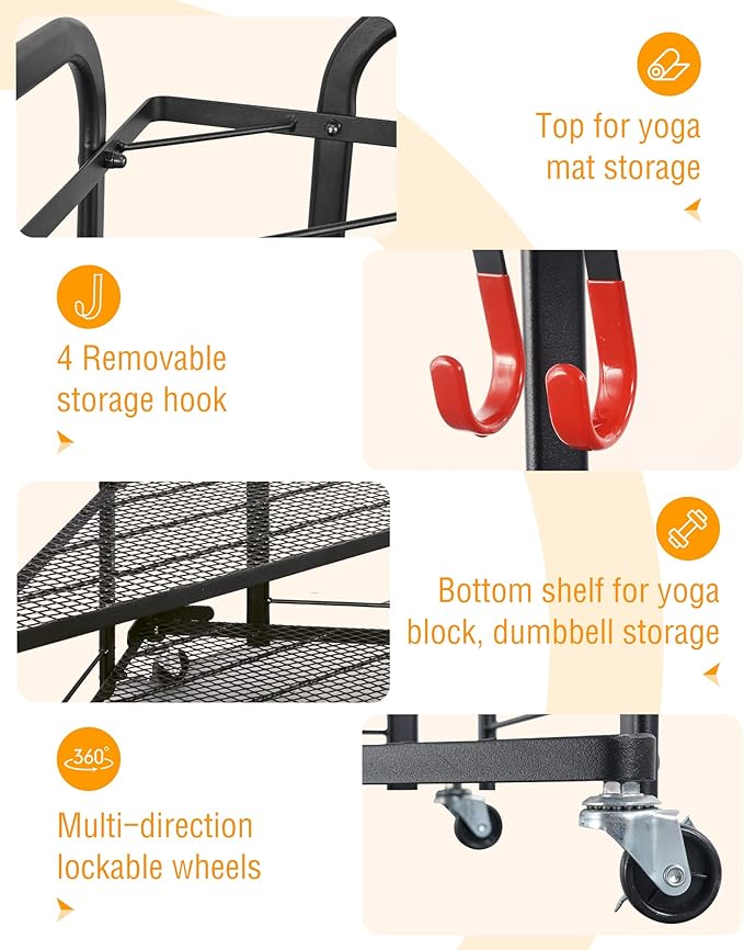- [Storage Various Items] This yoga mat rack can hold up to 4~6 yoga mat or yoga column, yoga blocks, resistance bands, dumbbell rack and kettle bell. Perfectly organize your workout equipment in one storage rack.
