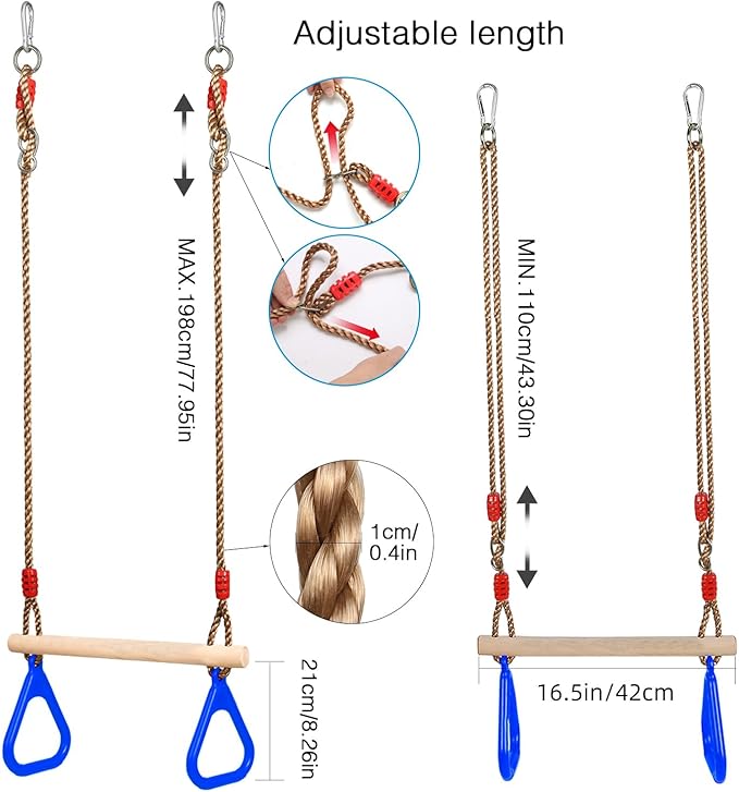 - ๐๐๐๐๐๐๐ ๐๐๐๐๐ ๐๐๐๐- Strong wood loadable up to 352LB/ 160KG, with the super wear-resistant and sturdy PP ropes (up to 10 mm in diameter), Wooden Swing Bar: 16.54inche/42cm in length and 1.18inche/3cm in diameter.