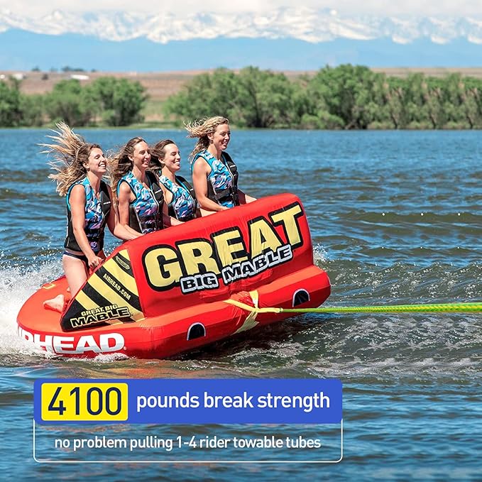 - Break Strength: The towable rope has a 4150 pound tensile strength and is suitable for 1 person towable tubes