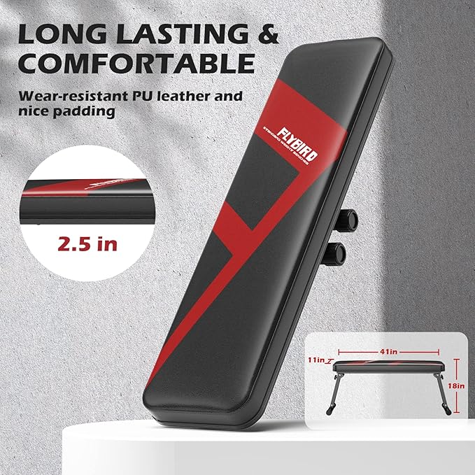 - 【Foldable to Store】FLYBIRD Flat Workout Bench can be easily folded with 1 knob & 1 pin on each side. You can fold it up against a wall or under a bed when you're not using it. The size of the cushion is 41*11 inches and the bench is 5.7 inches high when folded flat. Perfect for any small home gym space.
