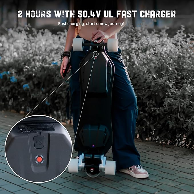 - [Ultra-High Power] The MEEPO voyager electric skateboard has a 2800W*2 high torque BLDC motor that enables it to travel at a top speed of 31 MPH and easily ascend inclination slopes of 46%. The 544.3Wh Molicel battery gives the voyager electric longboard a range of 30 miles after a full charge takes 3 hours using a 4.5A charger. This longboard will provide you with plenty of amusement.