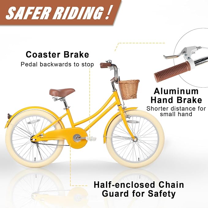 - 【Retro Style】The girls bike features a vintage-style metal frame and brown faux leather saddle, creating a unique and eye-catching look that will make your child a distinctive retro little rider.