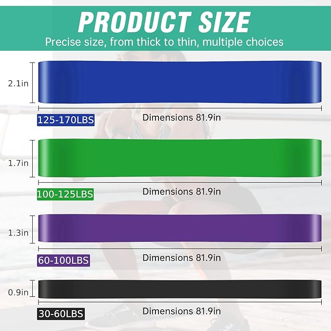 - Different Color & 4 Pull Up bands levels: Set of 4 pcs Pull up assist bands correspond to different colors, Black(30-60 lbs), Purple (60-100 lbs), Green (100-125 lbs),Blue (125-170 lbs), 81 inches in length and can be used alone or combine multiple workout bands to increase the challenge.