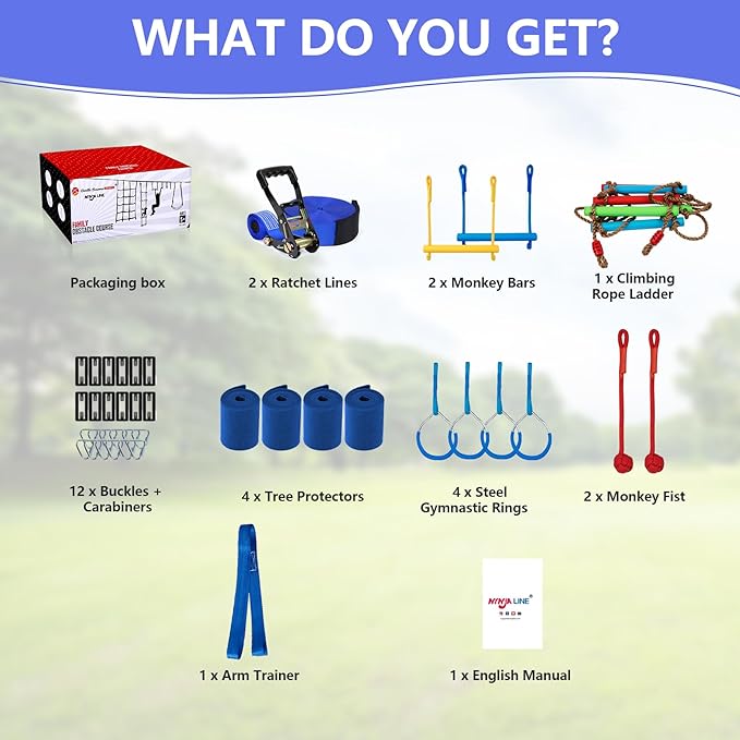 - FUN NINJA OBSTACLE COURSE: Our ninja training course are specially designed for kids over 5 years old. Upper Line can be installed 10 obstacles, and Ground Line can be used as a training line to improve strength and balance. Get your kids OUTSIDE and Overcome obstacles course of different difficulty in the most fun ways. Warriors never afraid of difficulties