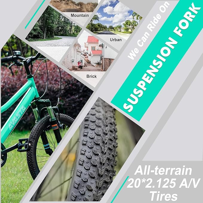 - 【Durable Frame and Fork】The durable frame is lower so it's easier for kids to stand over and hop on and off. High strength suspension fork and 20"x2.125" tyres can handle rough roads, paths and even some dirt.