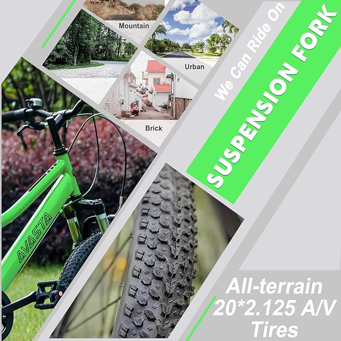 - 【Durable Frame and Fork】The durable frame is lower so it's easier for kids to stand over and hop on and off. High strength suspension fork and 20*2.125 tyres can handle rough roads, paths and even some dirt.