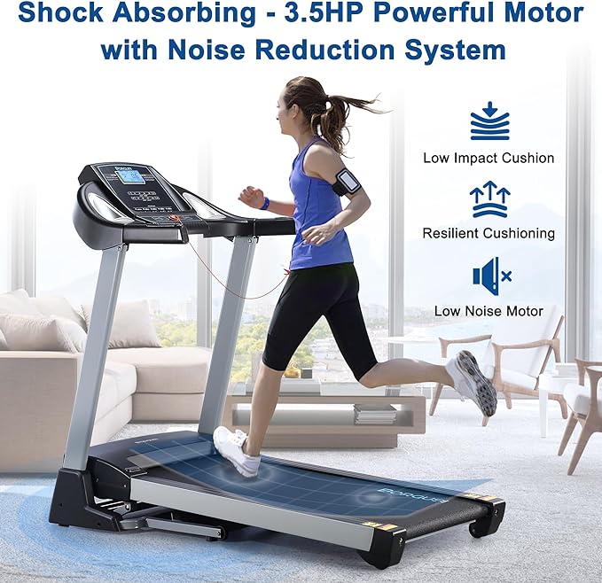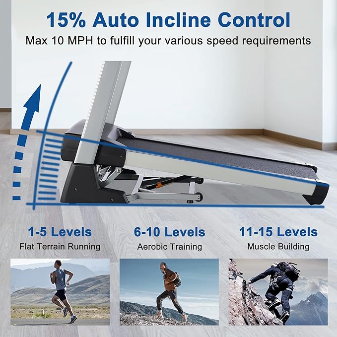 - Versatile Performance: With a powerful 3.5 HP motor, this treadmill offers speeds up to 10 MPH and a 0-15% auto-incline range, catering to various workout intensities from walking to advanced running.