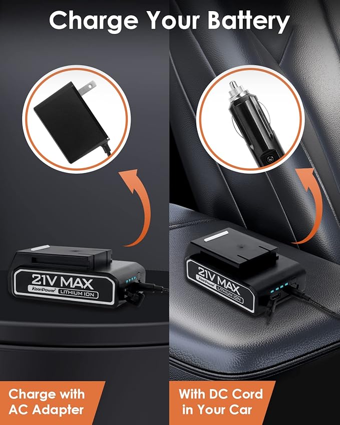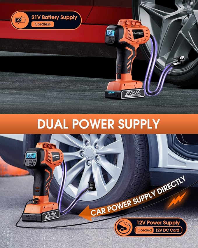 - DUAL POWER SUPPLY: 21V rechargeable Li-Ion battery pack power and 12V Car power DC adapter make inflating more convenient. Using a 12V car power DC adapter would be a great solution when on the go, in an emergency when the battery runs out.