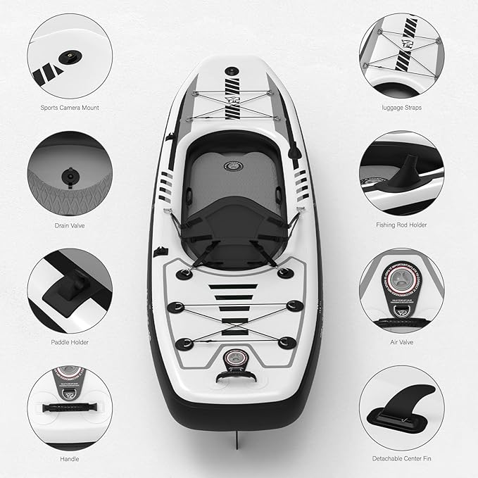 - Portable Design: Tigerxbang Inflatable kayak has baggage straps on the bow and stern to store backpacks and other items; a paddle holder on the side for easy carrying the paddle into the water with the kayak boat, or fishing on the fish rod holder to enrich your touring life.
