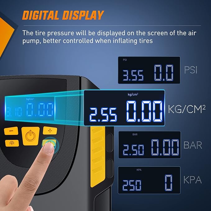 - Digital Display & LED Lighting: 4 pressure measurement units of PSI, KPA, BAR, KG/CM2. The tire pressure will be displayed on the screen of the air pump so that the pressure can be better controlled when inflating tires to ensure safety. Furthermore, the air pump comes with a LED lighting feature includes backup light, warning light and flash light modes to support your inflating needs in dark environment.