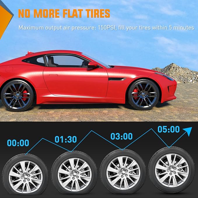 - No More Flat Tires: Nilight Tire Pump can inflate the 195/55/R15 car tires from 0 to 35psi within 5 minutes and capable of providing a maximum pressure of 150 psi and an airflow of 35L/Min. Professionally inflate your flat tires and much more effective and faster than traditional tire pump. A great solution for emergency on the way.