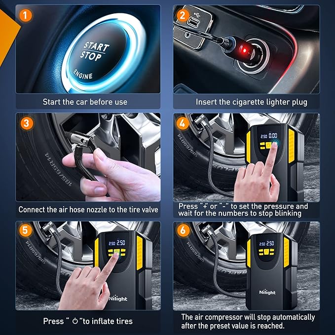 - Easy Operation & Auto Shutoff: Start car ignition, connect cigarette lighter plug to the 12V DC power outlet, set the desired value, and wait for the numbers to stop blinking. Turn on the switch, the air compressor will stop automatically when the preset value is reached. No more attention and keep an eye on it until itβs full.