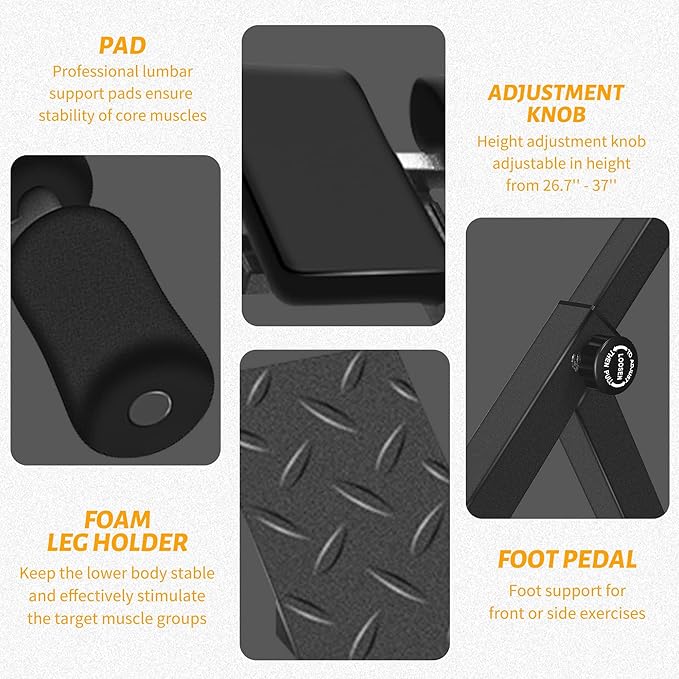 - Durable Construction – Crafted from high-strength carbon steel with an anti-abrasive coating, this hyperextension bench offers cushioned support and foot pads for comfort. It supports up to 245 pounds, ensuring long-lasting durability in your home gym