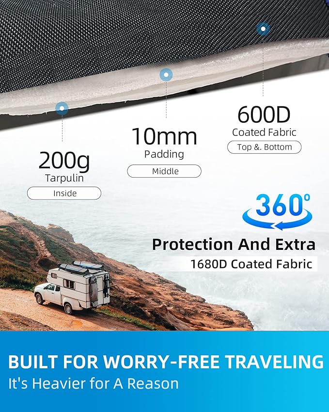 - 360° PROTECTION: With 200g PE tarpaulin inside, 10mm (0.4 inches) padding each side in between, 600D/1680D coated fabric on top, and extra fabric reinforced at head and tail sections each side, this surfboard travel bag is built for worry-free traveling. It provides all-round protection on your bag especially in long distance travel.