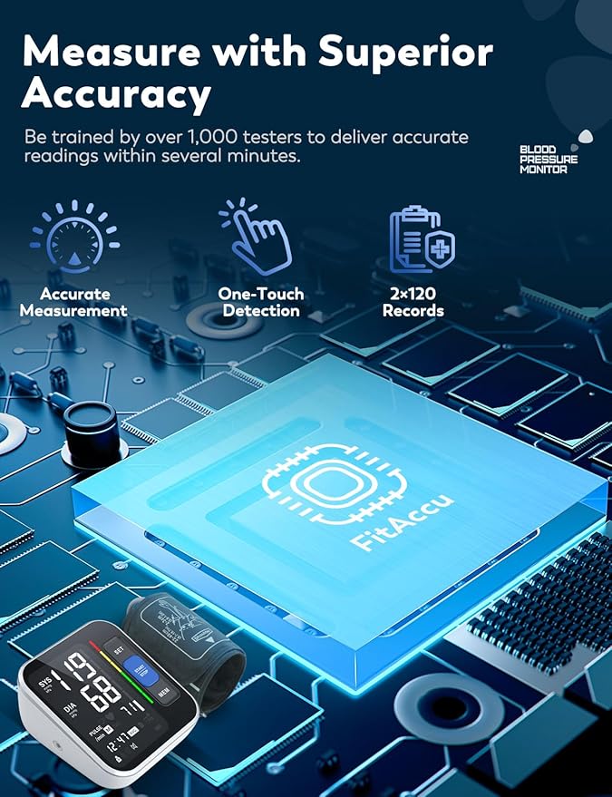 - ใ๐๐ข๐ ๐ก ๐๐๐๐ฎ๐ซ๐๐๐ฒ ๐๐ & ๐๐ ๐๐จ๐ง๐ข๐ญ๐จ๐ซ๐ข๐ง๐ ใ Built-in with our latest FitAccu chip and advanced AI algorithms that have been trained by over 1,000 testers, this blood pressure monitor detects your blood pressure with superior high accuracy. While measuring the blood pressure, it also detects your heart rate and will alert you if there is any irregular heartbeat detected.