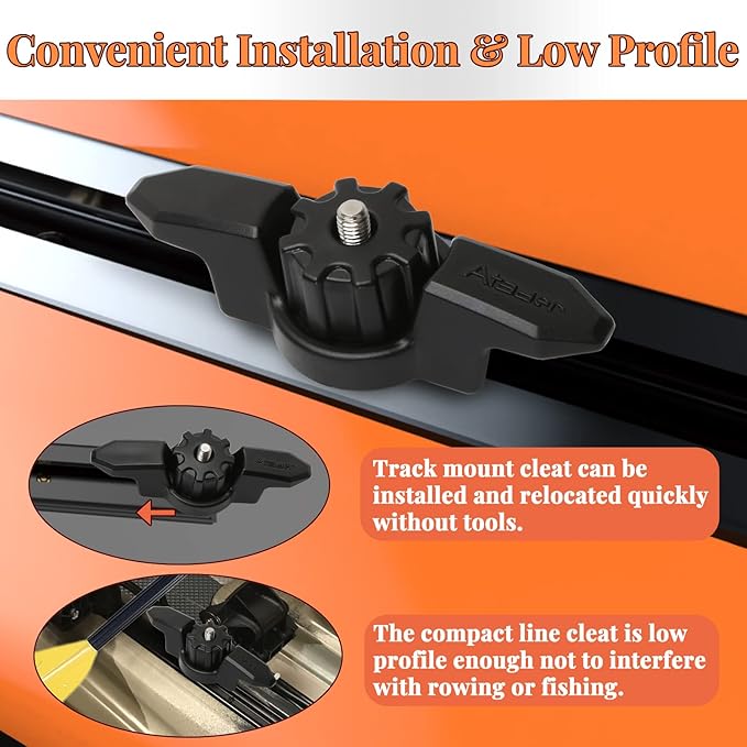 - Track mount cleat can be installed and relocated quickly without tools. It can be moved on the rail directly and mounted to the required position without drilling holes on the kayak. The compact line cleat is low profile enough not to interfere with rowing or fishing