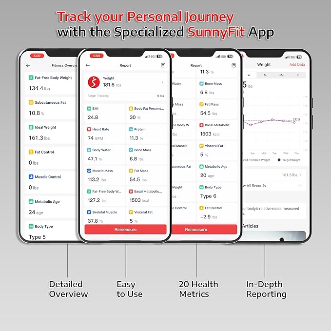 - 【IN-DEPTH BODY ANALYSIS】Each of the 20-health metrics can give even more information with just a tap on SunnyFit. See target weights, recommended ranges, progress, articles, and more for every metric to have a deeper understanding of your progress.