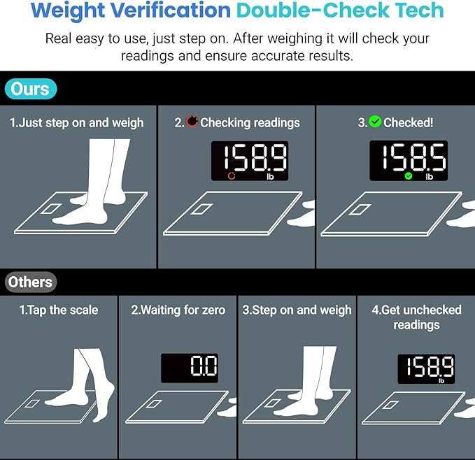 - ๐ช๐ฒ๐ถ๐ด๐ต๐ ๐ฉ๐ฒ๐ฟ๐ถ๐ณ๐ถ๐ฐ๐ฎ๐๐ถ๐ผ๐ป ๐๐ผ๐๐ฏ๐น๐ฒ ๐๐ต๐ฒ๐ฐ๐ธ ๐ง๐ฒ๐ฐ๐ต: Experience unmatched convenience and accuracy. Simply step on, and the scale quickly checks and ensures precise resultsโno need to tap or wait for the display to show zero
