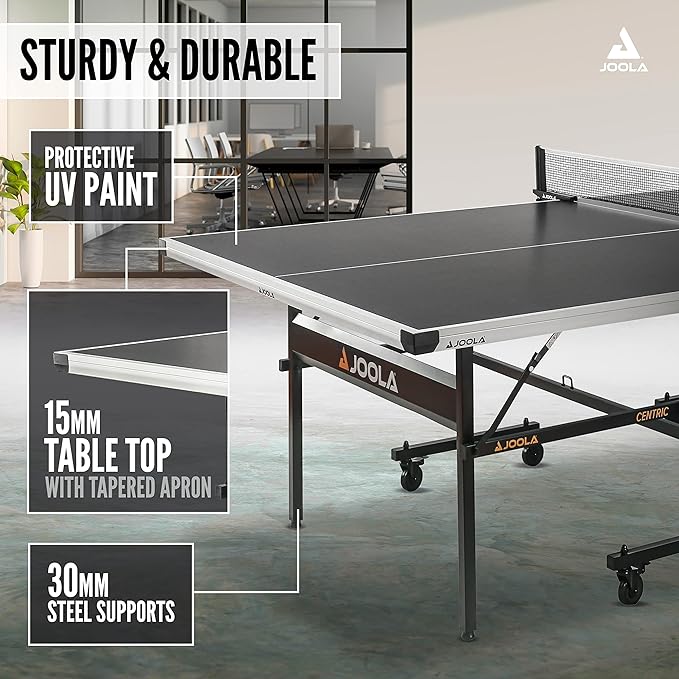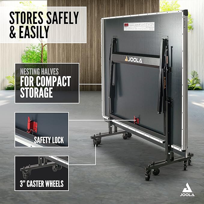 - ARRIVES READY TO PLAY IN MINUTES: Boxed to be delivered in perfect condition. Setup takes 10 minutes, simply unwrap the protective packaging, attach the legs, clip on the net & you are ready to play! Visit our store for JOOLA paddles, balls, & robots
