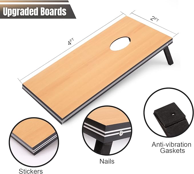 - 【Durable and Sturdy】We have done many improvements to the boards to make them more durable and sturdy than other cornhole boards. Firstly, we have added Anti-vibration gaskets on the bottom of the board legs, which can help the boards stay still when the bean bags hit the board. Secondly, we have added brace support in the middle of the back, which protects the board from the bag shock.