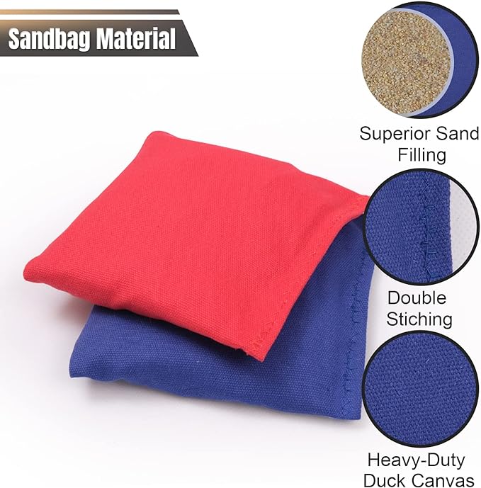 - 【Valuable Corn Hole Set with Carrying Case】The set includes 2 cornhole boards( 4x2feet), 8 bean bags(5.5x5.5inches), and 1 big carrying bag. The carrying bag can be used to pack everything up and protect the boards inside from dirt and moisture. Keep everything tidy and neat when you are not using them!