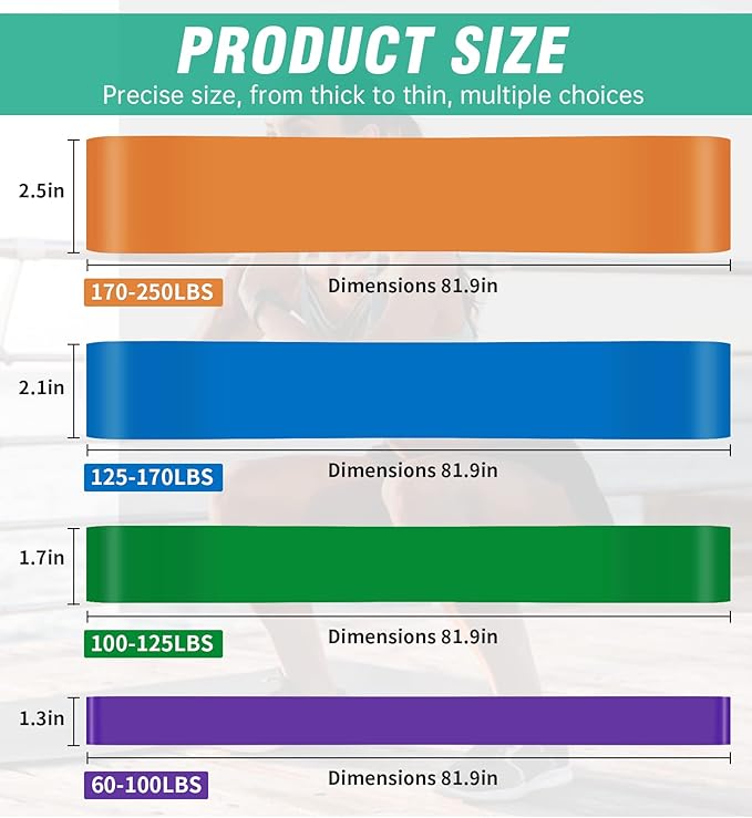 - Different Color & 4 Pull Up bands levels: Set of 4 pcs Pull up assist bands correspond to different colors, Purple (60-100 lbs), Green (100-125 lbs),Blue (125-170 lbs), Orange (170-250 lbs), 81 inches in length and can be used alone or combine multiple workout bands to increase the challenge.